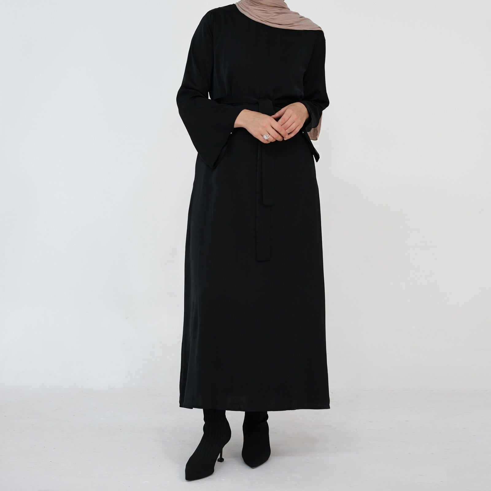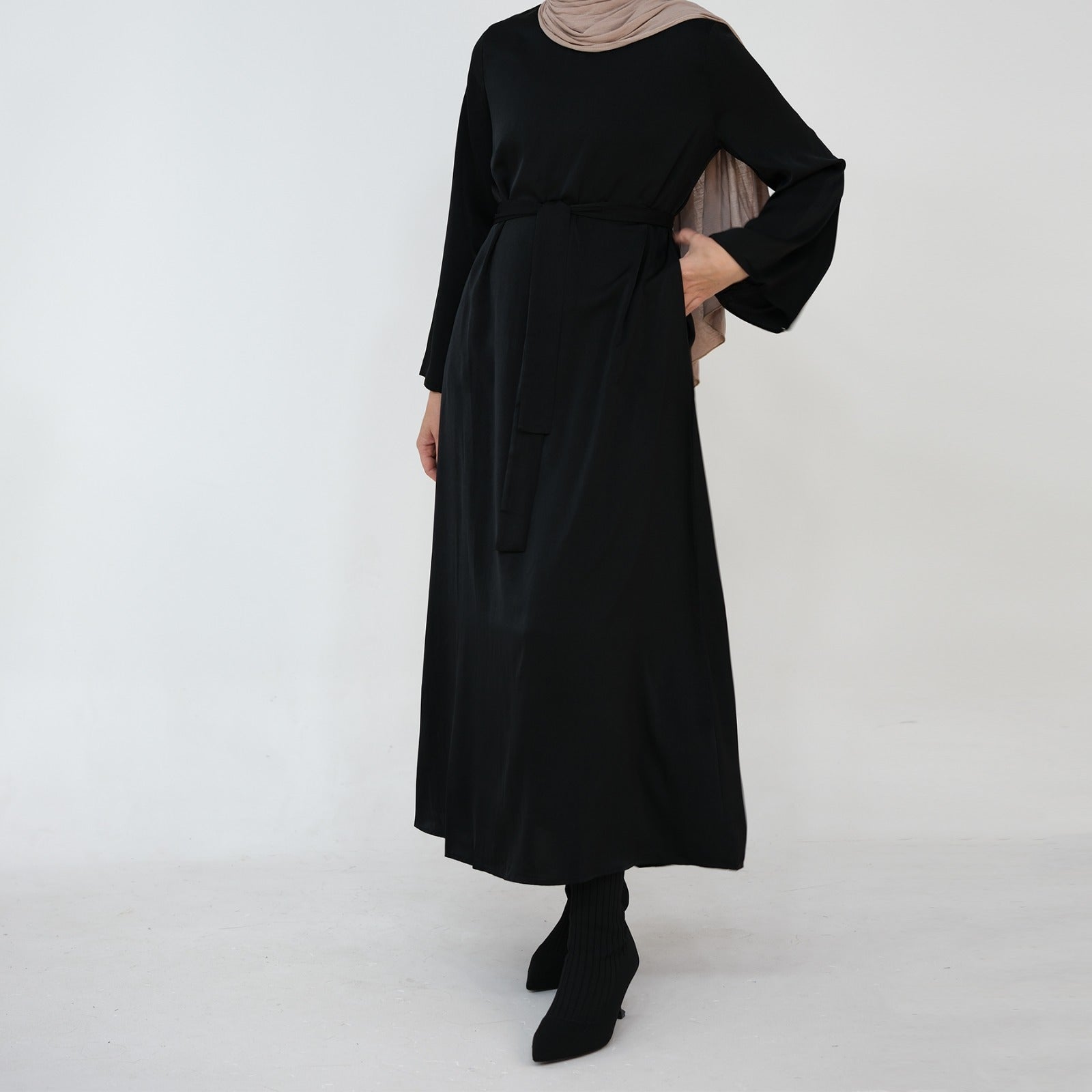 Ontdek de Nachtzwart Zijdezachte Satijn Abaya Jurk – een tijdloze kleur die elegantie en modern minimalisme uitstraalt. Dit diepe, inktzwarte satijn vangt het licht op een subtiele manier en geeft elke outfit een chic, luxueus karakter. De soepele stof valt vloeiend langs het lichaam en creëert een moderne, moeiteloze look die perfect is voor elke gelegenheid.